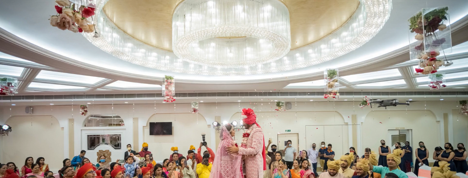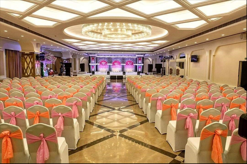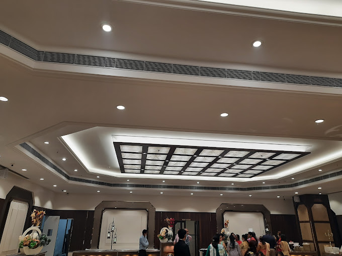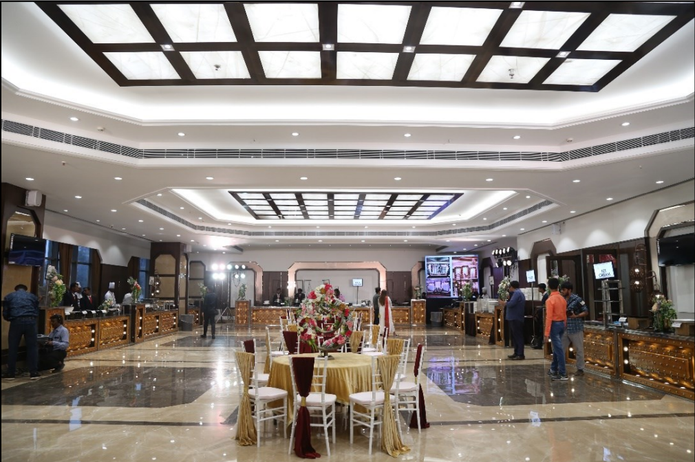 The Palace Banquet’s interior design is a perfect blend of grandeur and sophistication, featuring high ceilings with elegant geometric patterns, ambient lighting, and luxurious marble flooring.